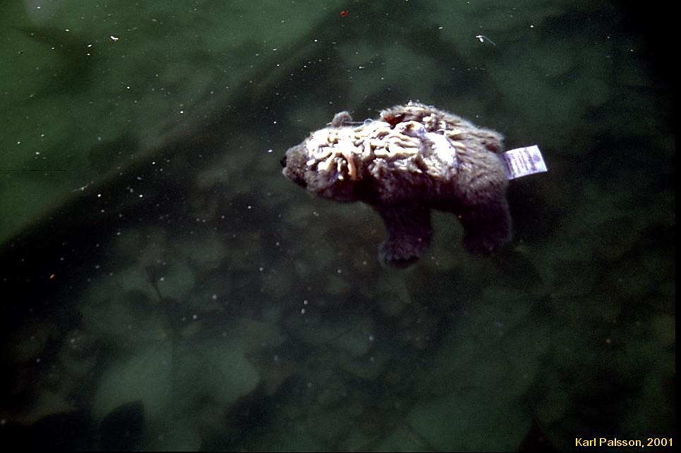 Someone's toy floating in the pond near the library