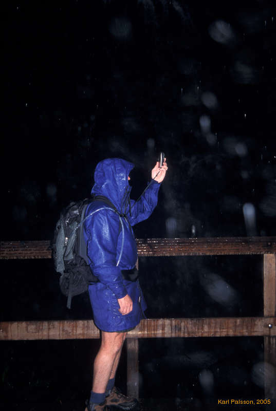 Andrew McRae doing some extreme weather testing (and tree cover testing) of his new eTrex Vista. Berry Creek Falls lookout