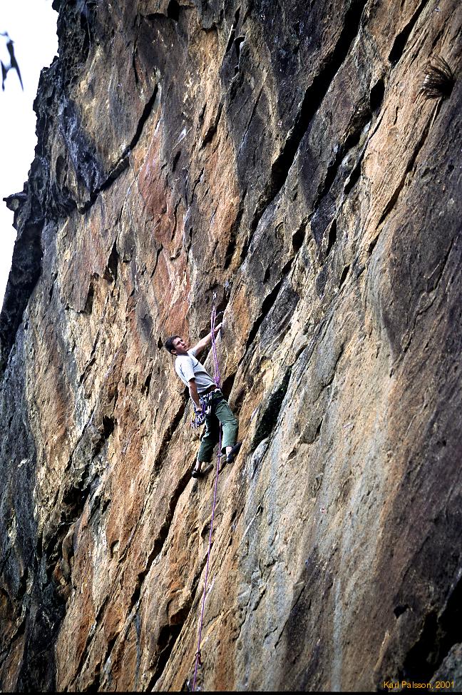 Of course, I get a bit hung up, and end up lowering off to let Bob's superior skills take over. Bob cleans up the first pitch, and I muscle/pull/getpulled to the top to be his belay slave for the next pitch. James continues yelling (un)helpful hints and vague memories of the time he and maxwell claimed to have done the climb. :) He was at least kind enough to take some pics for us. James claims that the sport gods are frowning upon us, especially after I take a bit of a chunk out of a nice figners edge with a hook, and that we will be struck down for our sins.