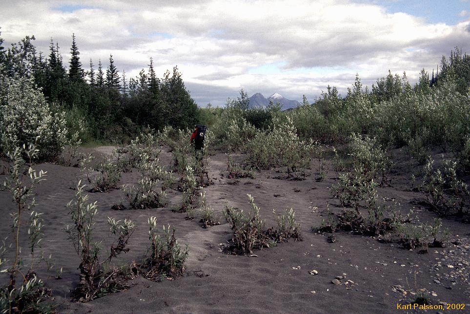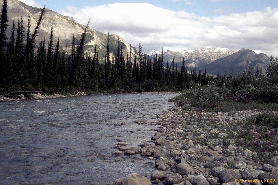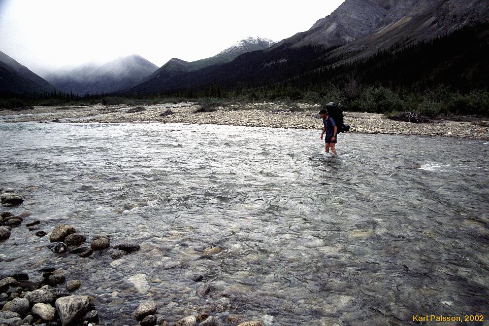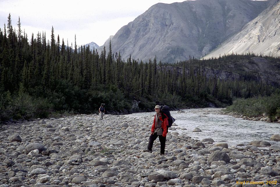 | This was the hardest walking we did. We were on day 4 by now, and certainly weren't as fresh and nimble as we once were. (I think we were probably at steady state though, I could actually have kept walking like this for days if we had had more food, you just sort of get into a rythm) This was Taiga at it's best. We tried walking down by the river, but it was thick vegetation, constant re-routing to avoid the interminable braidings of the creek (Hot Springs Creeek apparently, though very very very few people take the time to even try and look for the springs by the time they are in this area) and uneven ground.