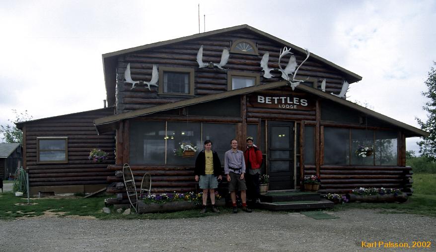 | Get back into Fairbanks, rent a car, and head off to Chena Hot Springs (resort). Lovely and relaxing. See a moose by the pond at the hot springs, and a big beaver on the road. Go figure. Guess our trip was a bit too much wilderness. Check in at Billies again, and head off for dinner. We must have been quite a sight at Billies, almost everyone else there was on a much lower budget than we were, right down to the people cooking lentils in the kitchen. We however, were aviators. With nearly $1100 in plane fares, $20 on dinner for an extra two or three nights was pocket change. No trying to scum lifts to denali for us. We went north to Fox for dinner at the brewery (recommended by two guides, and also the brewery of my favourite pickaxe) but the brewery is basically shut, isn't serving dinner's that night, and has a very very lame bar. The alaskan's have a lot to learn about tourism. Sometimes you just want a souvenir, and you can't get it. Oh well.